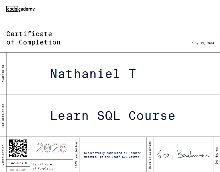 Cours sur SQL Portfolio2025-01-30T08:39:43+00:00 Portefeuille Description juillet 1, 2024 Identifiant de la certification: FA2F374A-8